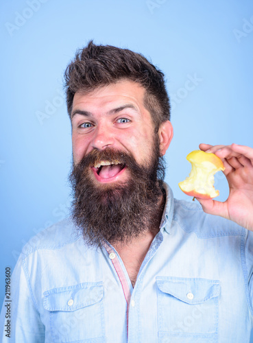 Eat Apple Every Day Man Handsome Hipster Long Beard Eating Apple